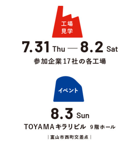 さてさて、国内産業のさまざまなニュースが飛び交う昨今ではありますが、富山のものづくりをさらに盛り上げるべく、今夏7/31(木)〜8/3(日)の4日間 、県内有志企業が集い “トミファ” オープンファクトリーが開催されます。