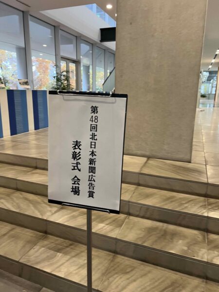 先日、北日本新聞広告賞の表彰式に出かけました。幸いにも当社がをお手伝いした新聞広告が2点入賞したので、広告主さまをお祝いするためにスタッフとともに参加した次第です。